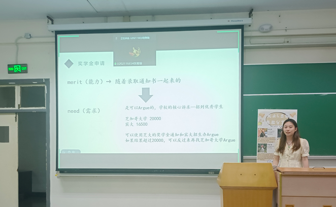 接下来进行分享的是郭静智同学。她主要从自己基本情况、奖学金申请、北美博士申请这三个方面展开介绍。在奖学金方面,她详细分享了取得更多奖学金的经验,告诉大家既要考虑自己的能力,也要关注自己的需求。之后,她又阐述了美国硕士和博士的区别,提醒大家所申请的学校和自己研究方向的匹配度是最重要的。最后她鼓励大家时刻要将自己视作一个值得被尊重的独立个体,勇敢尝试各种机会。