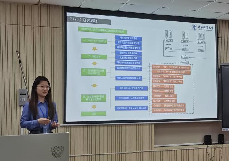分论坛的最后一位讲演者为中央财经大学马克思主义学院博士生刘佳欢。在《网络微短剧对青年网络精神生活建构的影响探析》一文中,刘佳欢同学从网络微短剧的蓬勃爆发反映人们网络视听使用习惯的演变,揭示了精神需求的多样性发展,聚焦网络微短剧在网络精神生活建构中的作用,利用扎根理论研究方法探究微短剧在青年群体中的流行动因,微短剧对青年网络精神生活的影响。网络微短剧通过符号表征、审美认同和需求满足等环节,导致青年群体沉迷媒介幻境、让渡主观能动性,在虚实交互中自由发展,形成一种全新的网络精神生活模式。王彦蓉副教授指出刘佳欢同学探究虚拟世界中的网络微短剧对青年网络精神生活建构的影响,引发如何让虚拟世界为现实社会服务的思考,从以色列学者Yoram Eshet Alkalia的数字素养概念框架中,提出培养社会—情感素养、驾驭超媒体素养技能等参考建议。于婷婷老师建议刘佳欢同学拓展案例研究范围,加深研究分析层次。